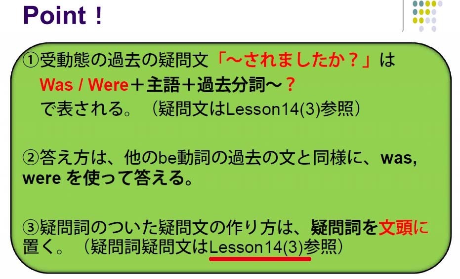 ①受動態の過去の肯定文「~されました。」は、was / were +過去分詞で表す。