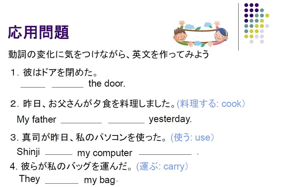 We studied Japanese history last year.(私たちは去年、日本史を学習しました。)• 動詞によっては、d, ed 以外に変化する場合があります。