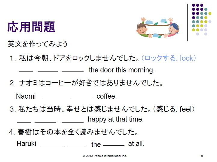 有料講座中の応用問題の3では、「3. 私たちは幸せとは感じませんでした。          happy.」となっていますが、下記のように、「私たちは当時、幸せとは感じませんでした。         happy at that time.」に変更いたします。